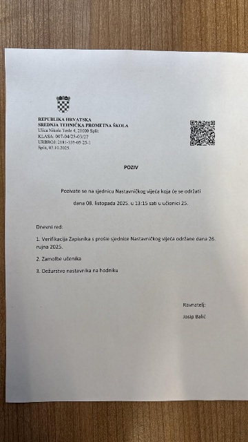 Nastavničko vijeće održat će se u srijedu, 8. listopada 2025., u 13:15h, u učionici 25.